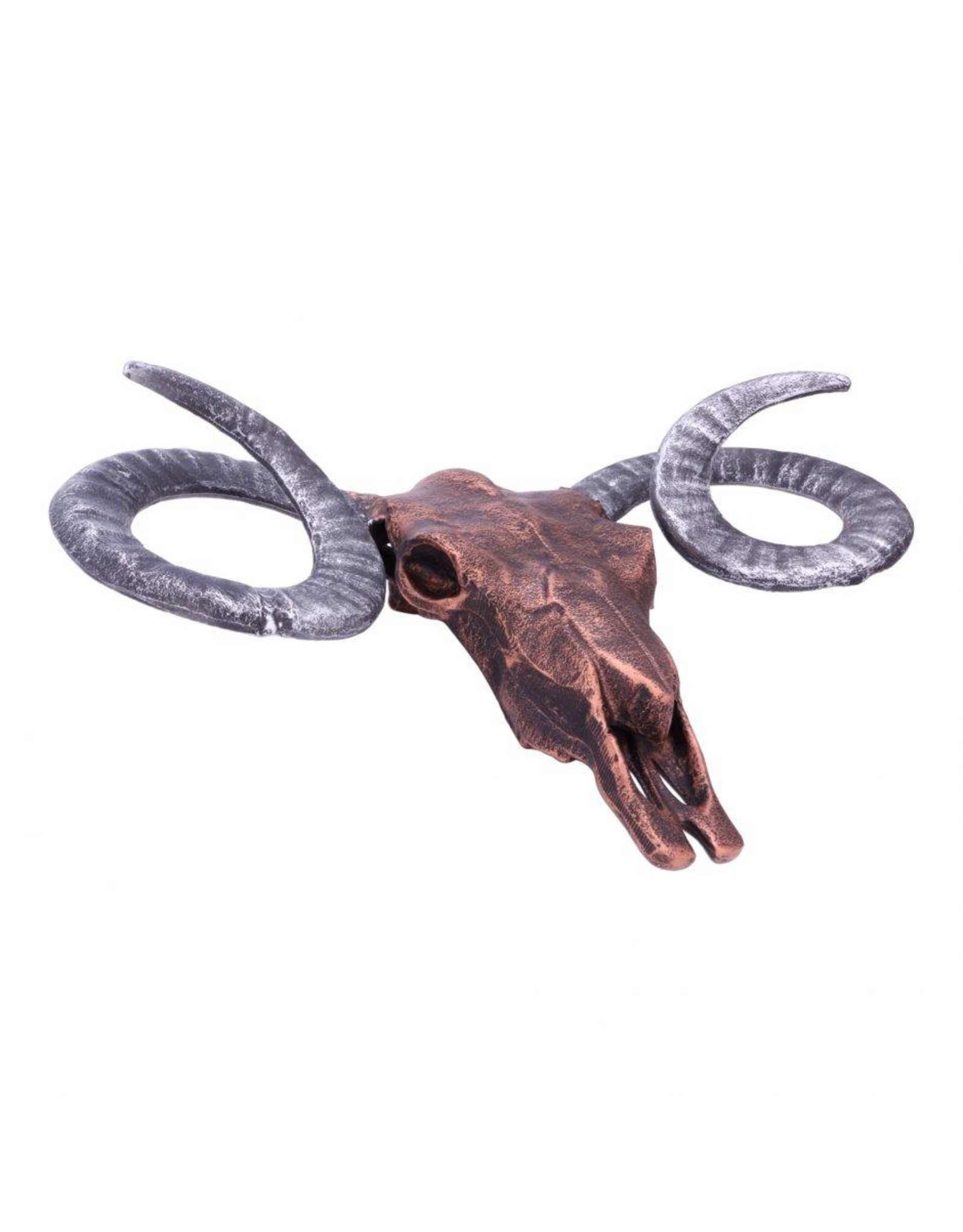 This stunning wall sculpture is of a bighorn sheep skull, complete with magnificent spiraled horns. Finished in a deep copper with silver horns.